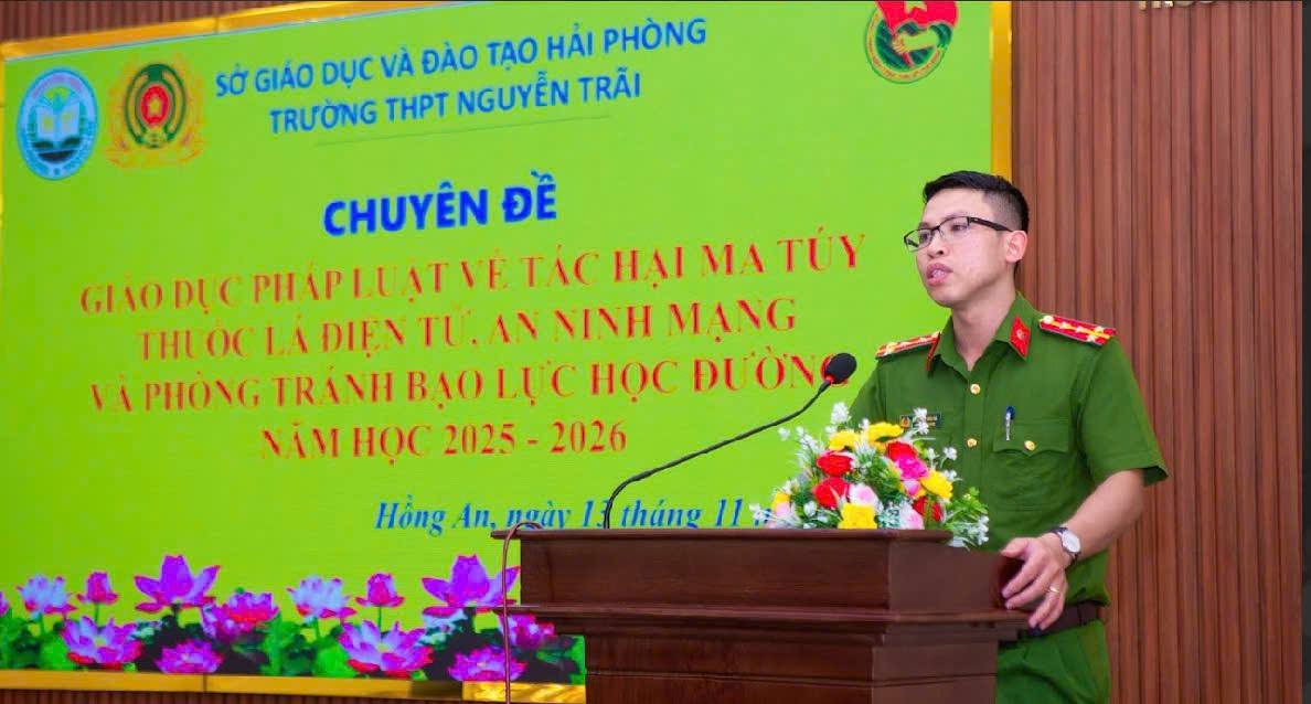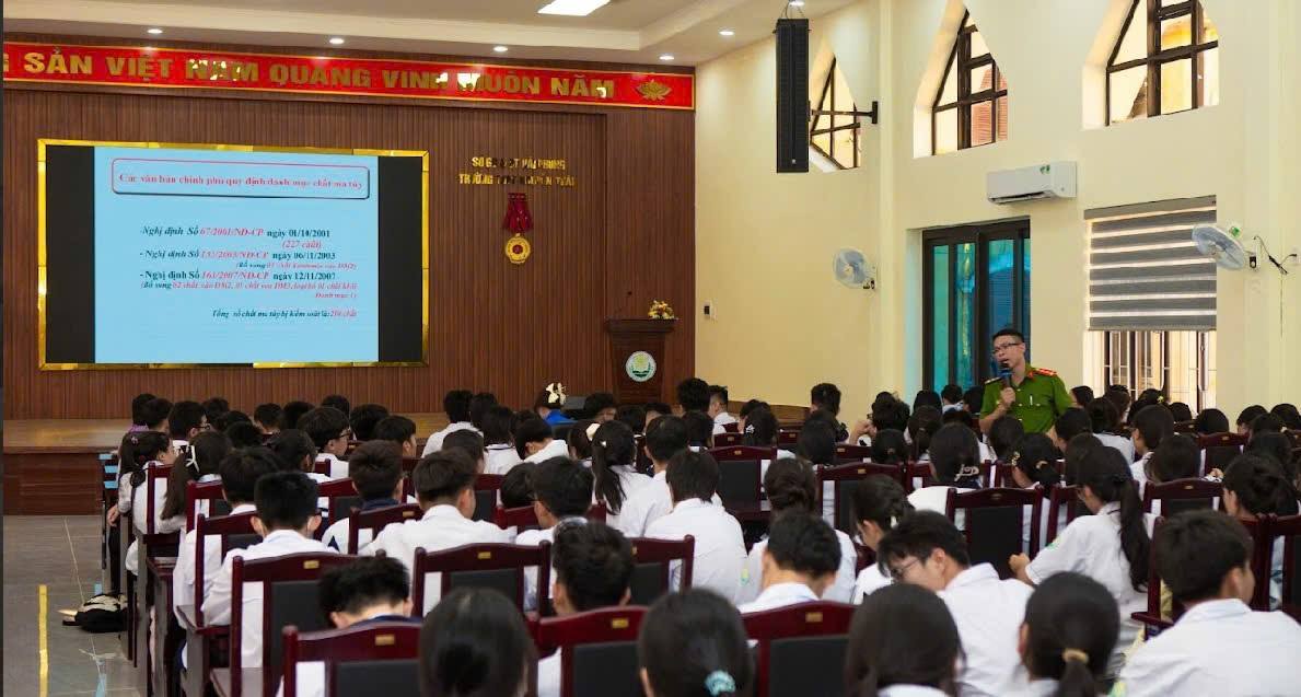 Trong phần nội dung đầu tiên, báo cáo viên đến từ lực lượng Công an đã cung cấp cái nhìn toàn diện về tác hại ma túy và các loại ma túy mới đang xuất hiện trong giới trẻ. Những thủ đoạn tinh vi như ma túy được ngụy trang dưới dạng thực phẩm, đồ uống, kẹo, trà sữa… được phân tích rõ ràng, giúp học sinh nhận diện nguy cơ và nâng cao cảnh giác. Báo cáo viên cũng giải thích chi tiết các quy định của pháp luật về xử lý hành vi tàng trữ, sử dụng ma túy, đặc biệt là chế tài đối với người chưa thành niên, giúp các em hiểu rõ hậu quả pháp lý khi vi phạm.