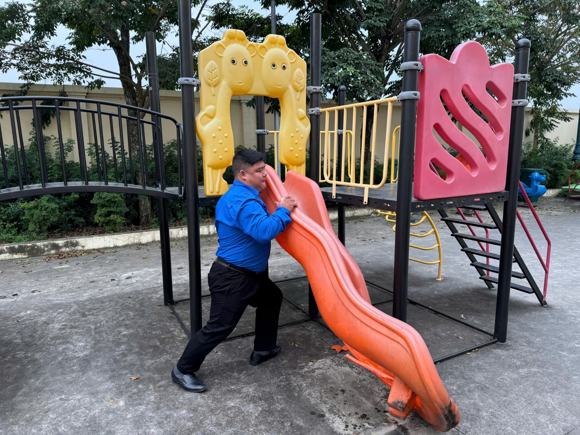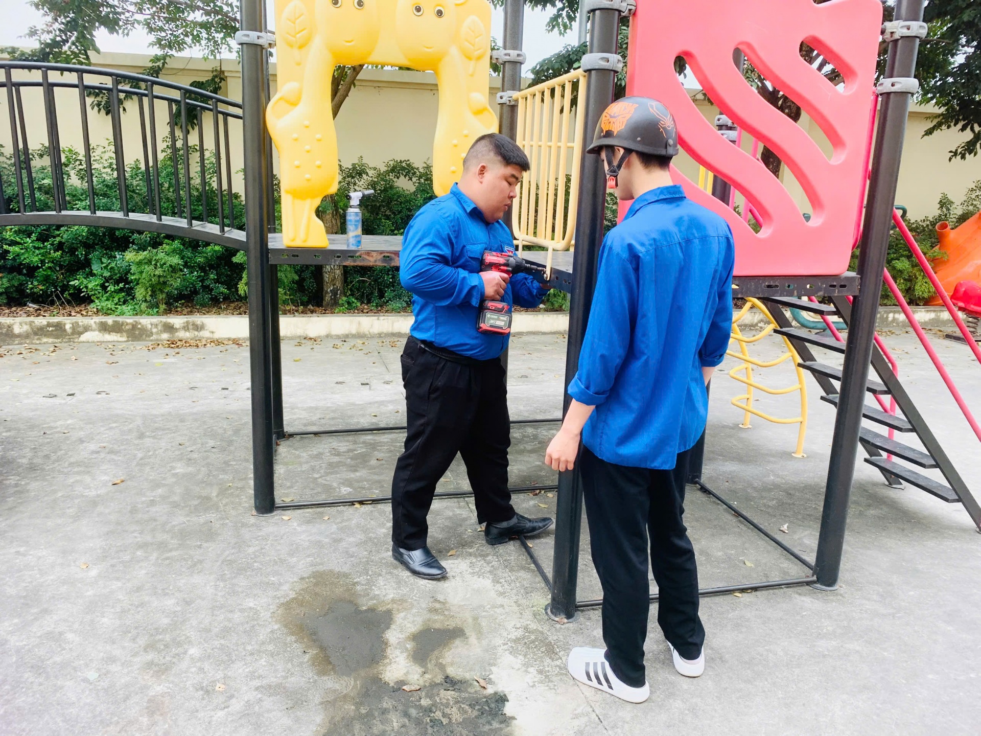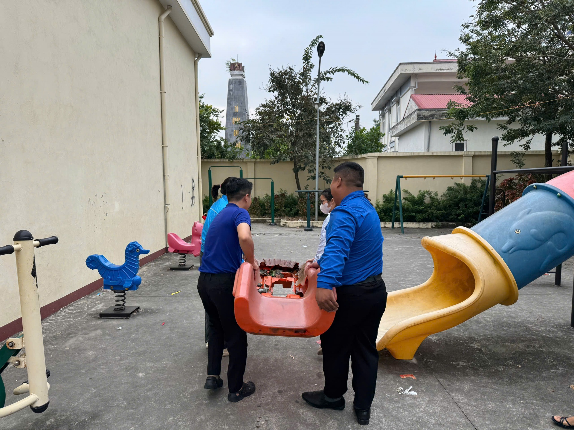 • Vệ sinh và cải tạo cảnh quan: Phát quang bụi rậm, thu gom rác thải, tạo mảng xanh xung quanh khu vực vui chơi.
