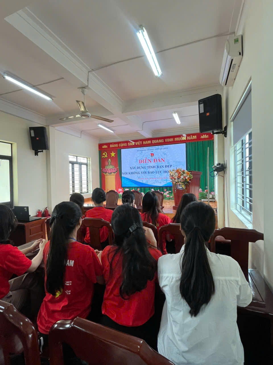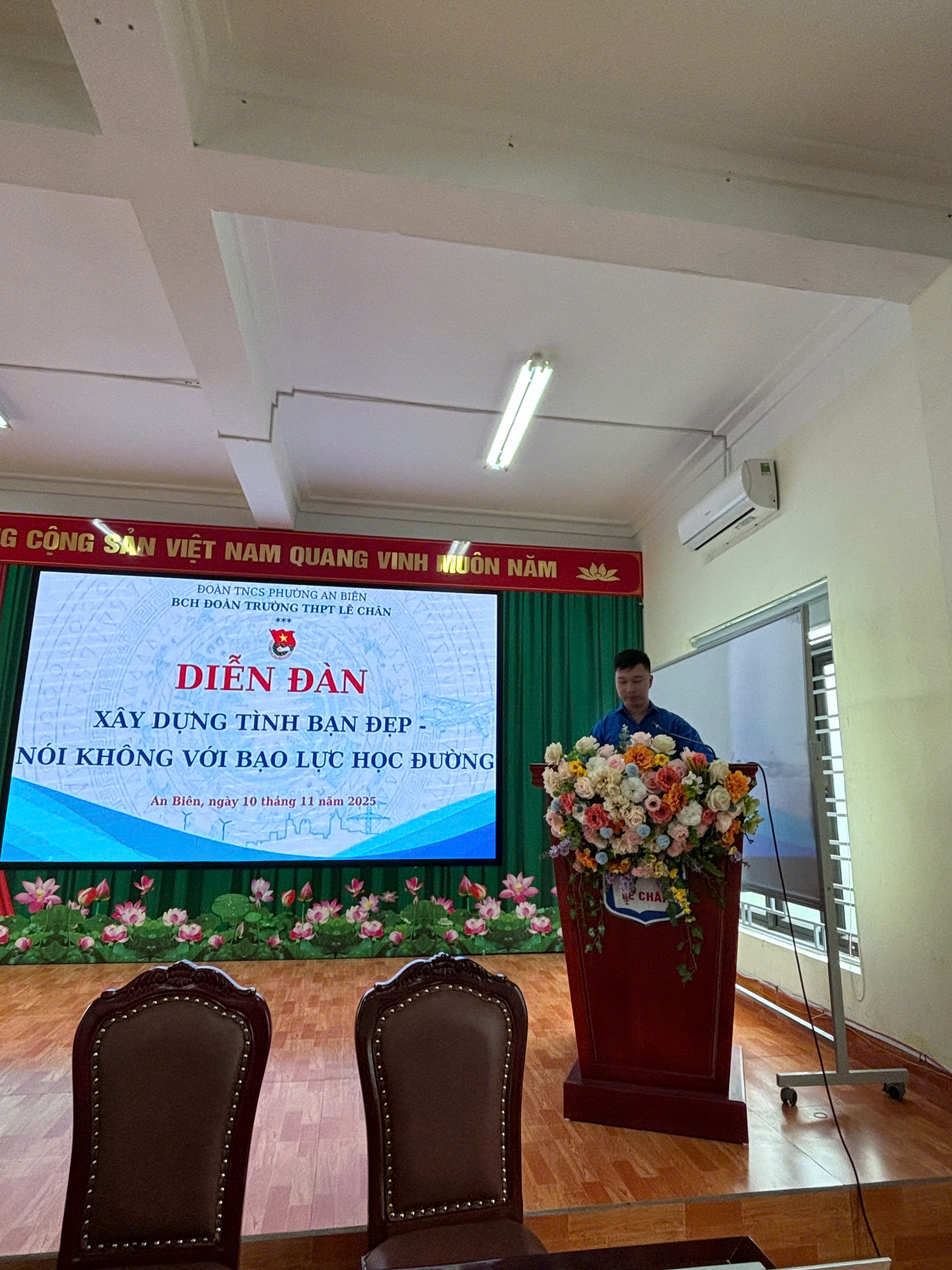 Thực hiện Chương trình Công tác Đoàn và phong trào thanh niên trường học năm học 2025 - 2026, ngày 10/11/2025, Đoàn trường THPT Lê Chân tổ chức Diễn đàn xây dựng tình bạn đẹp - nói không với bạo lực học đường tại Hội trường nhà trường với sự tham gia của hơn 70 đoàn viên, thanh niên là Bí thư chi đoàn và lớp trưởng các lớp.