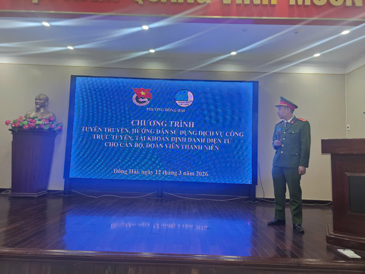 Thực hiện Chương trình Công tác Đoàn và phong trào thanh thiếu nhi năm 2026, Kế hoạch Tháng thanh niên năm 2026; ngày 12/3/2026, BTV Đoàn phường Đông Hải tổ chức Chương trình tuyên truyền, hướng dẫn sử dụng dịch vụ công trực tuyến, tài khoản định danh điện tử cho hơn 200 cán bộ, đoàn viên thanh niên. Tại Chương trình, đồng chí Phạm Công Minh - Phó Bí thư Chi đoàn Công an phường đã truyền đạt những nội dung chính của chuyên đề. Dưới đây là 1 số hình ảnh: