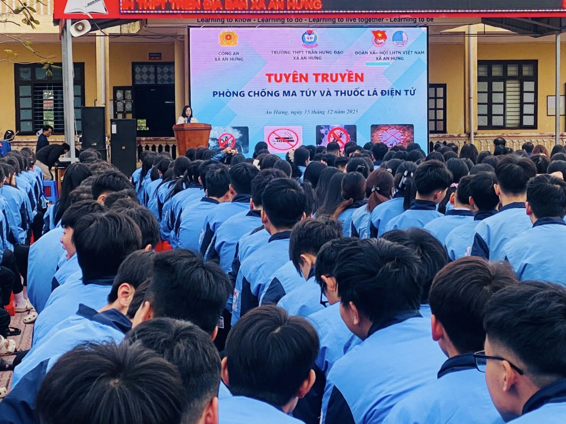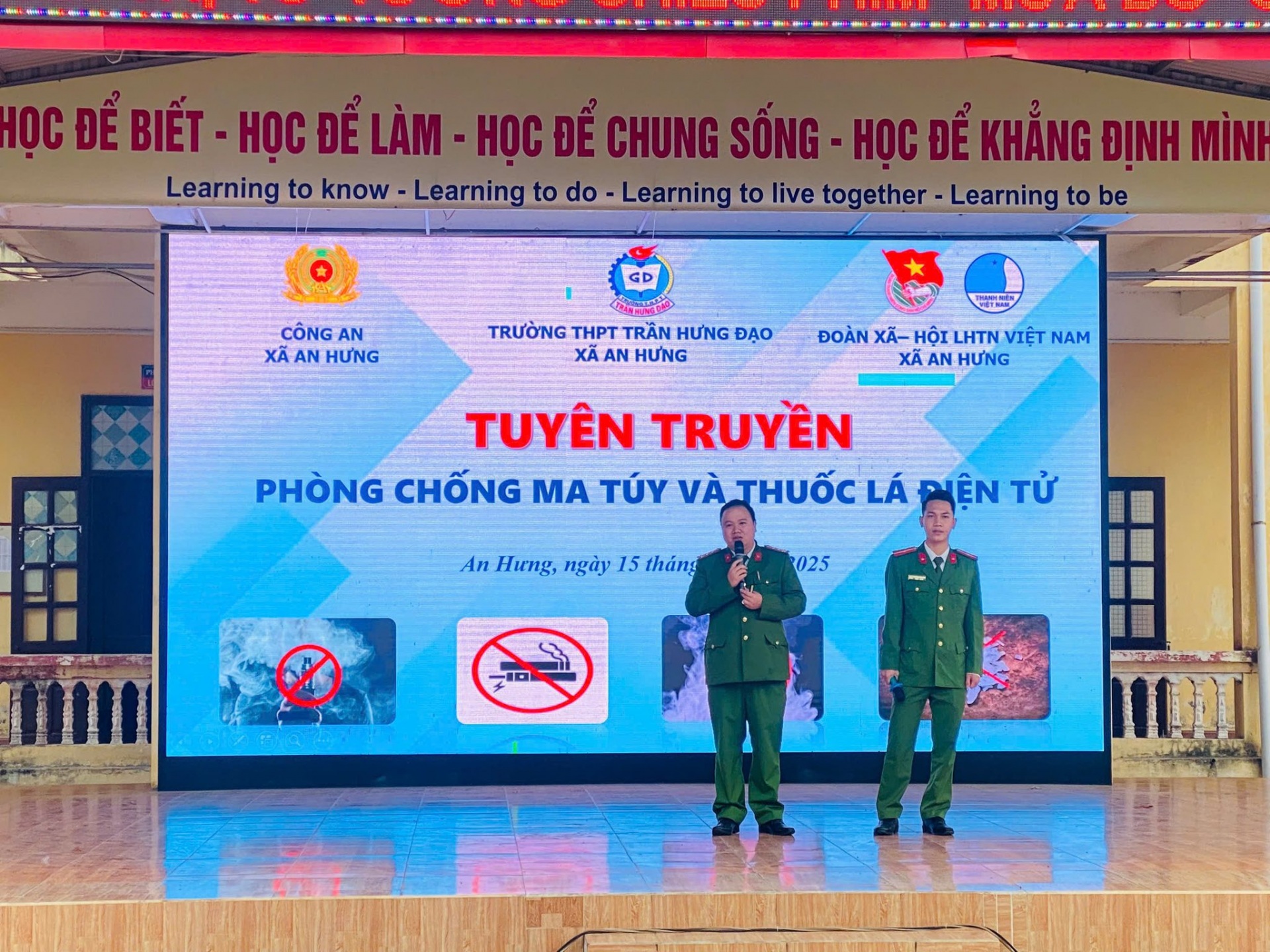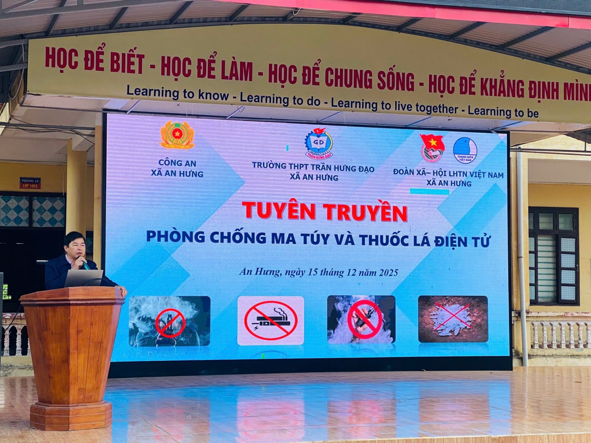 Thực hiện Chương trình công tác Đoàn và phong trào thanh thiếu nhi 6 tháng cuối năm 2025, sáng ngày 15/12/2025, Đoàn Thanh niên - Hội LHTN Việt Nam xã An Hưng, Công an xã An Hưng và trường THPT Trần Hưng Đạo phối hợp tổ chức tuyên truyền phòng chống ma túy và thuốc lá điện tử cho đoàn viên thanh niên, học sinh nhà trường.