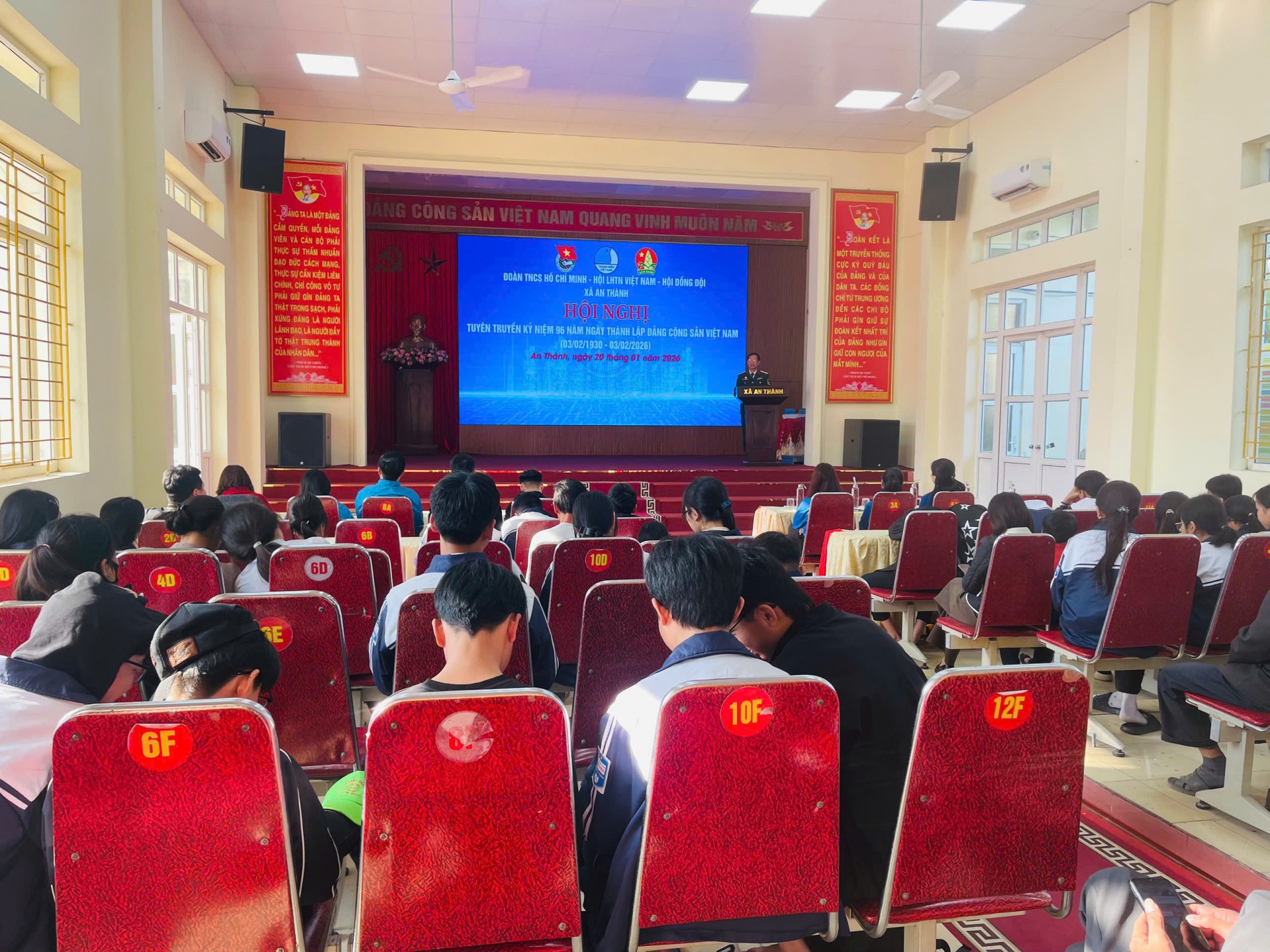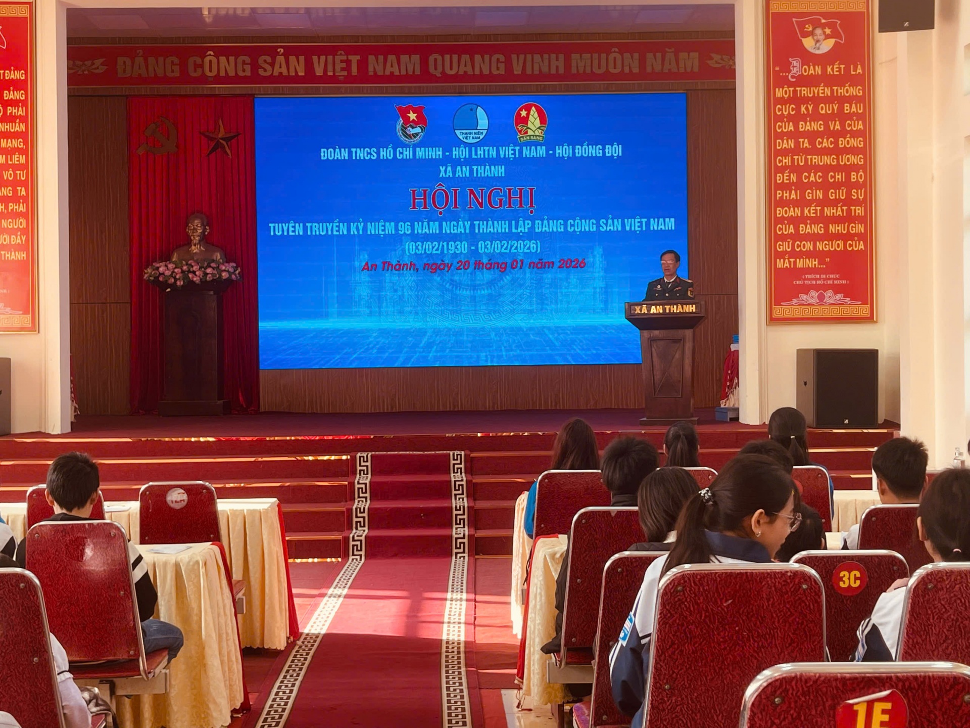 Thiết thực tổ chức các hoạt động chào mừng kỷ niệm 96 năm Ngày thành lập Đảng Cộng sản Việt Nam (03/02/1930 - 03/02/2026). Ngày 20/01 tại Hội trường Đảng ủy xã An Thành, Ban Thường vụ Đoàn xã An Thành tổ chức tuyên truyền kỷ niệm 96 năm Ngày thành lập Đảng Cộng sản Việt Nam và chào mừng Đại hội Đảng toàn quốc lần thứ XIV cho 70 cán bộ, đoàn viên, thanh niên.