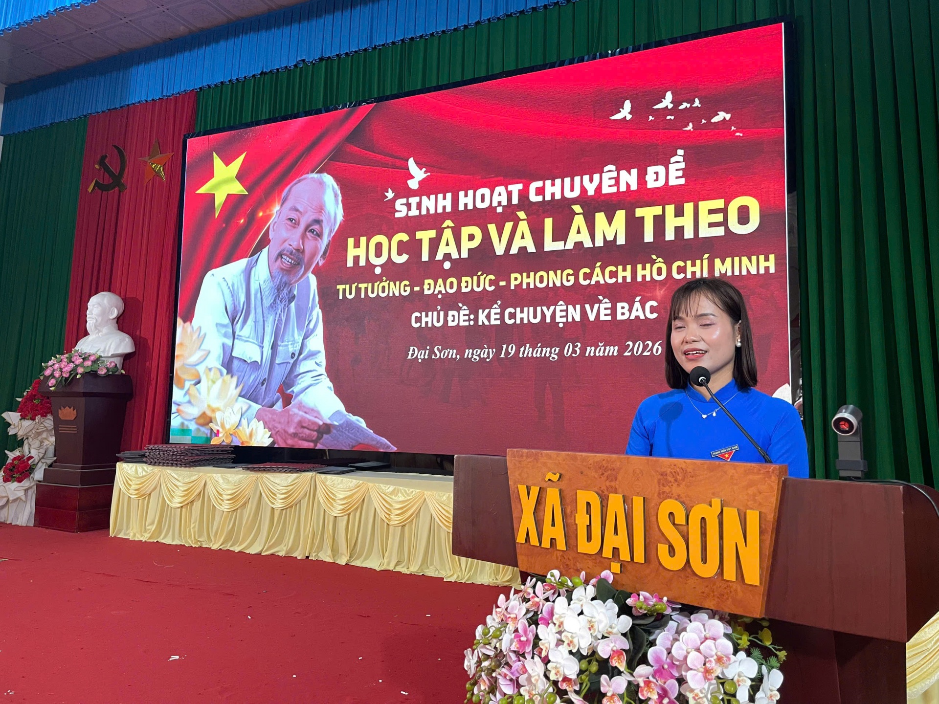 Thực hiện chương trình công tác Đoàn và phong trào thanh thiếu nhi năm 2026, nhằm tiếp tục đẩy mạnh việc học tập và làm theo tư tưởng, đạo đức, phong cách Hồ Chí Minh trong cán bộ, đoàn viên, thanh niên, ngày 19/3/2026, tại hội trường xã, Đoàn xã Đại Sơn đã tổ chức chương trình sinh hoạt chuyên đề “Học tập và làm theo tư tưởng, đạo đức, phong cách Hồ Chí Minh” với chủ đề “Kể chuyện về Bác”.
