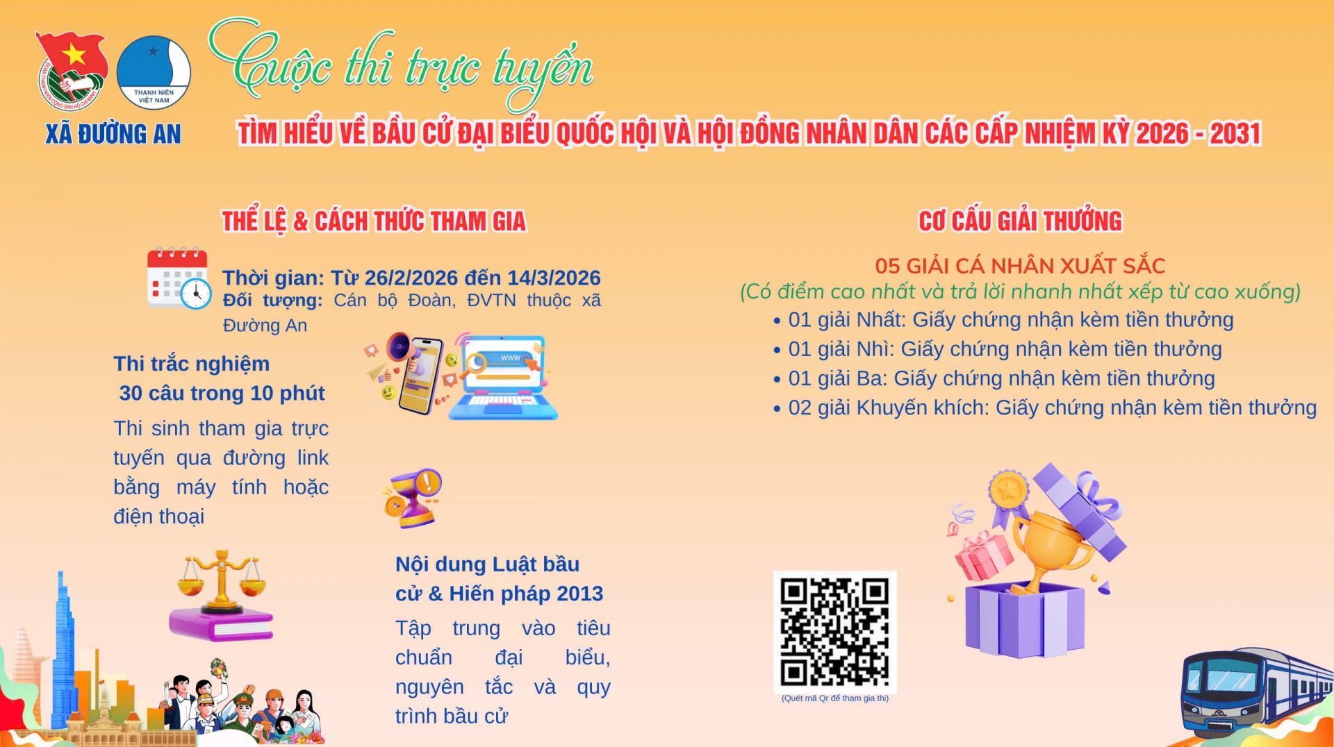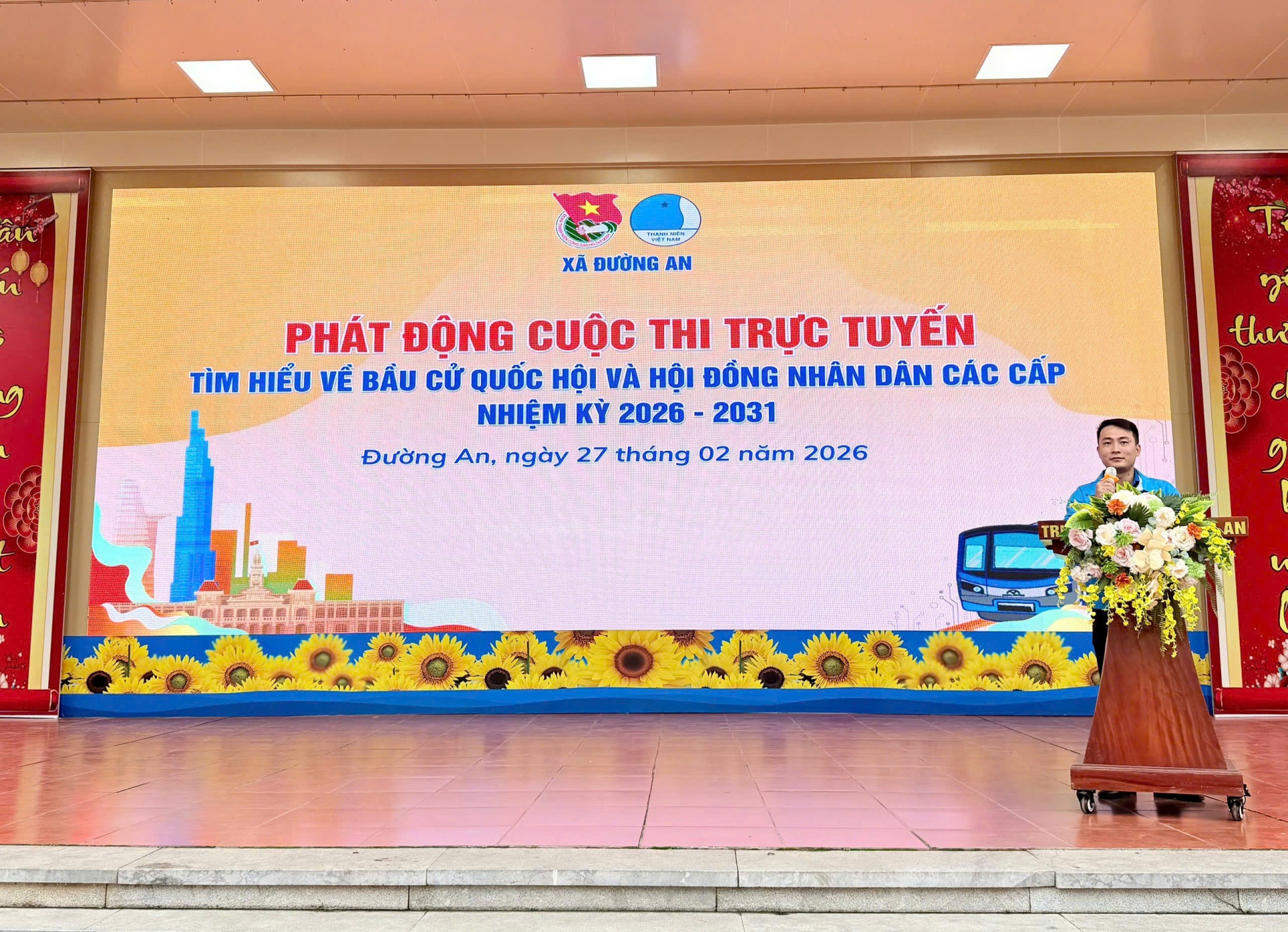 Thiết thực chào mừng Ngày Bầu cử đại biểu Quốc hội khóa XVI và đại biểu HĐND các cấp nhiệm kỳ 2026 - 2031, kỷ niệm 95 năm Ngày thành lập Đoàn TNCS Hồ Chí Minh (26/3/1931 - 26/3/2026), nhằm tạo sân chơi bổ ích để ĐVTN tìm hiểu pháp luật về bầu cử, Ngày 27/02/2026, Đoàn xã Đường An triển khai phát động Cuộc thi trắc nghiệm trực tuyến tìm hiểu về bầu cử đại biểu Quốc hội và bầu cử đại biểu hội đồng nhân dân” nhiệm kỳ 2026 – 2031 trong đoàn viên thanh niên