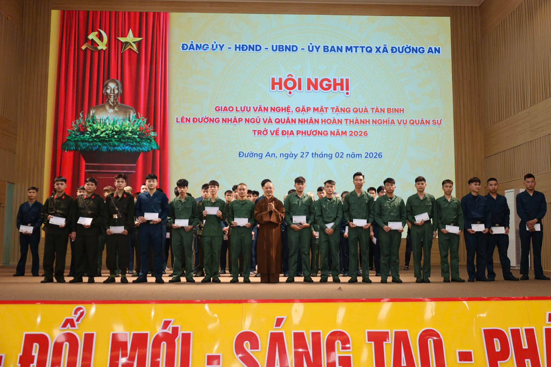 Tại chương trình, đồng chí Đào Đức Vỹ - Phó Bí thư Đảng ủy, Chủ tịch UBND xã, Chủ tịch Hội đồng NVQS xã đã phát biểu động viên, giao nhiệm vụ cho các tân binh trước ngày lên đường nhập ngũ; đồng thời mong muốn các tân binh tiếp tục phát huy truyền thống cách mạng của quê hương, luôn đoàn kết, kỷ luật, ra sức phấn đấu học tập, rèn luyện, hoàn thành xuất sắc mọi nhiệm vụ được giao. Cũng tại chương trình Đảng ủy, HĐND, UBND, UBMTTQ và các tổ chức chính trị xã hội và Đại đức Thích Tâm Nguyện - Trụ trì Chùa Diên Phúc Mộ Trạch xã đã tặng quà cho 58 thanh niên nhập ngũ; tặng Giấy khen cho 35 thanh niên tình nguyện viết đơn xin nhập ngũ năm 2026; trao Sổ đoàn và Huy hiệu đoàn cho các tân binh.