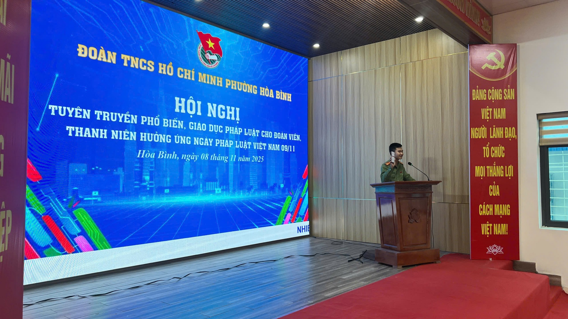 Hưởng ứng Ngày Pháp luật Việt Nam 9/11, chiều ngày 8/11/2025 Đoàn Thanh niên phường Hòa Bình phối hợp với Công an phường tổ chức buổi tuyên truyền phổ biến giáo dục pháp luật cho đoàn viên thanh niên tại Trụ sở ĐU - UBMTTQVN phường.
