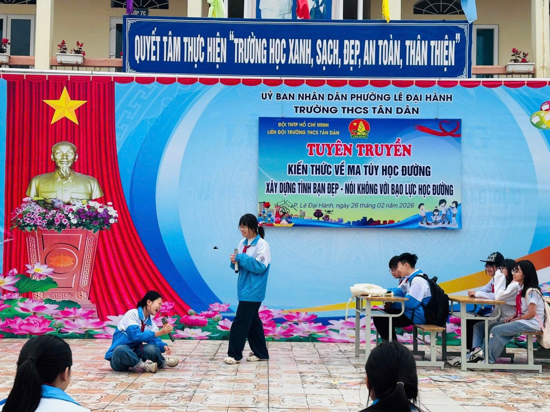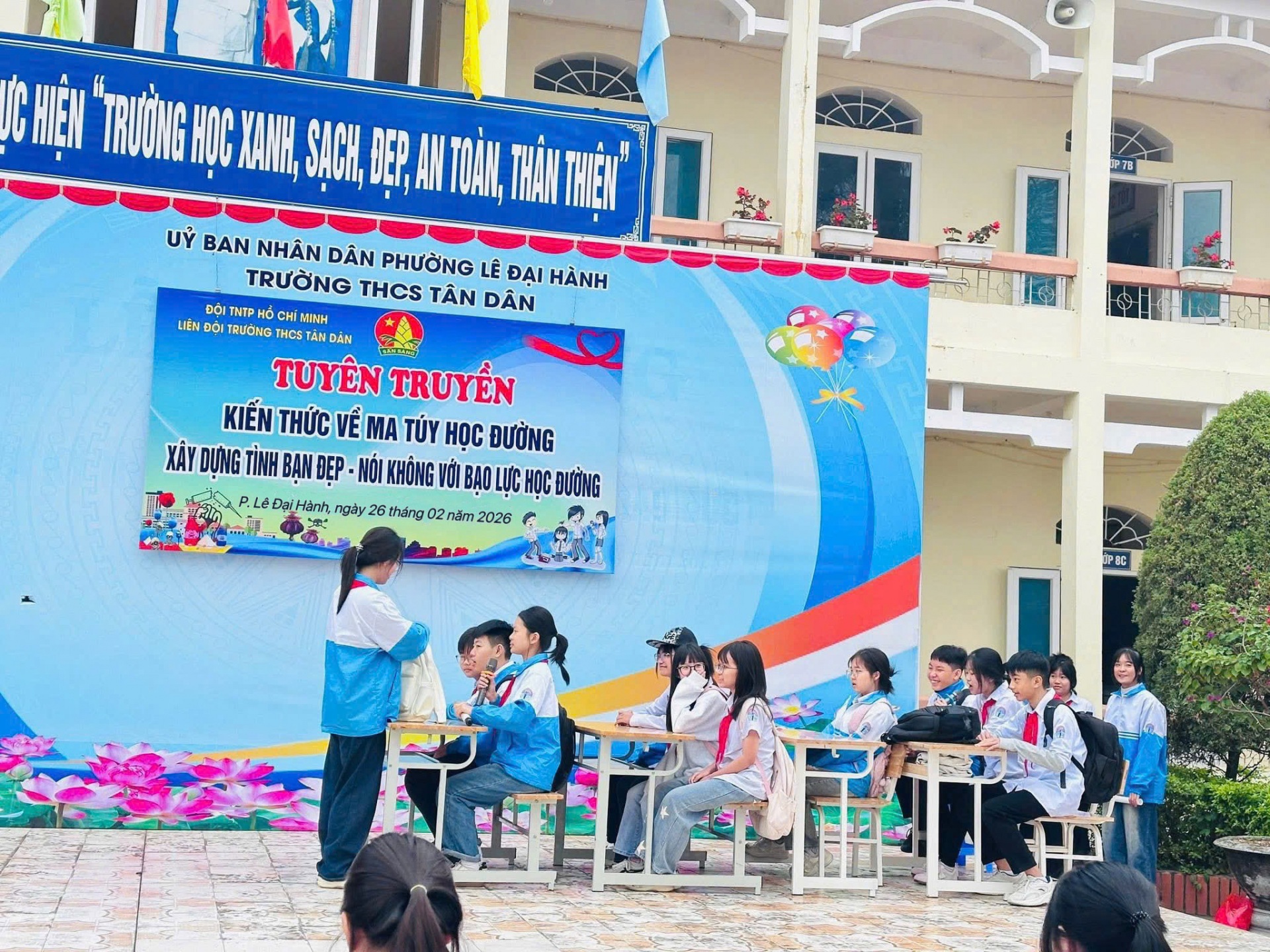 Sáng ngày 26/2/2026, Liên đội Trường THCS Tân Dân tổ chức Diễn đàn tuyên truyền với chủ đề “Xây dựng tình bạn đẹp – Nói không với bạo lực học đường; Tuyên truyền an toàn giao thông.