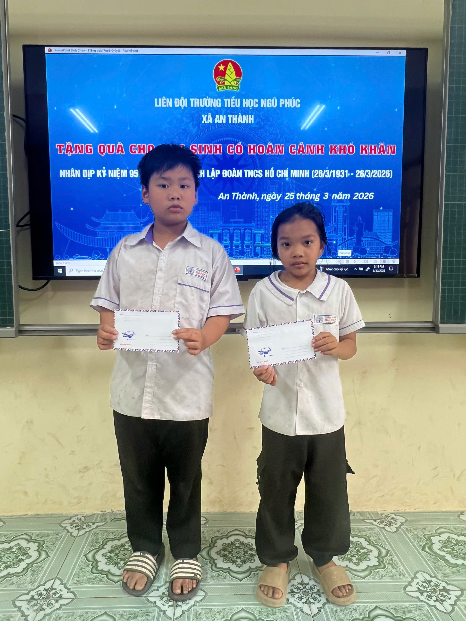 Thiết thực tổ chức các hoạt động chào mừng kỷ niệm 95 năm Ngày thành lập Đoàn TNCS Hồ Chí Minh (26/3/1931 - 26/3/2026). Ngày Liên đội trường Tiểu học Ngũ Phúc, xã An Thành tổ chức tặng 05 xuất quà với tổng trị giá 2 triệu đồng cho học sinh có hoàn cảnh khó khăn vươn lên trong học tập.