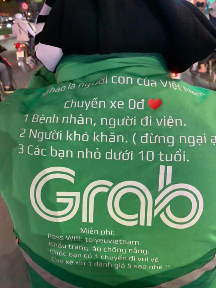 Cuốc xe của mình chỉ khoảng 2km, gần về đến nhà thì bất chợt mình nhìn thấy mấy dòng chữ phía lưng áo bạn chạy xe, cứ tưởng Grab triển khai chương trình hay ho này, nhưng không phải. Lúc hỏi, bạn nói đây là dòng chữ bạn tự mang ra ngoài in để người đi xe, nếu khó khăn, bạn sẽ chạy xe miễn phí.