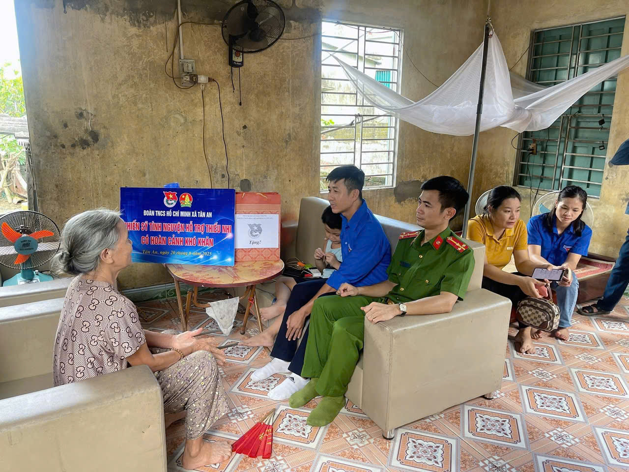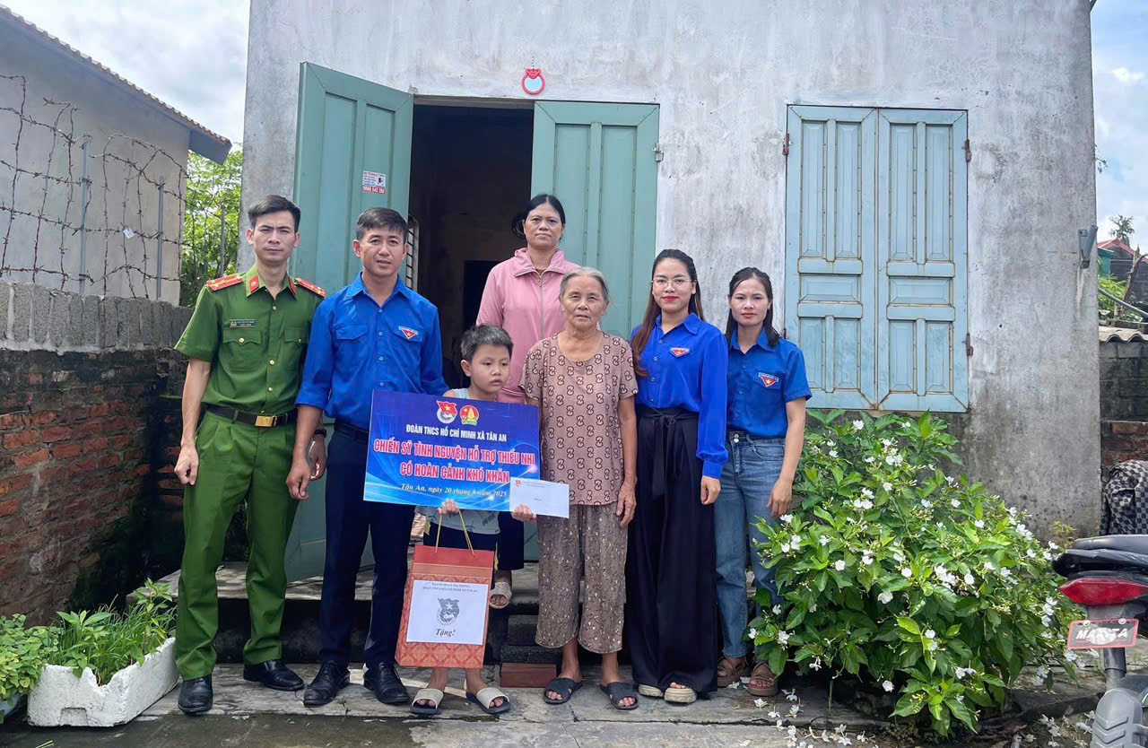 Trước thềm năm học mới , ngày 20/8 BCH Đoàn xã Tân An đã tổ chức thăm hỏi, tặng quà cho em Đặng Tài Đức, sinh năm 2017 tại xóm Bắc, thôn Tân Hợp, xã Tân An có hoàn cảnh khó khăn (Hoàn cảnh: hộ nghèo, mẹ thần kinh, bố nuôi 3 con, sống trong căn nhà nhỏ trật trội và khó khăn)