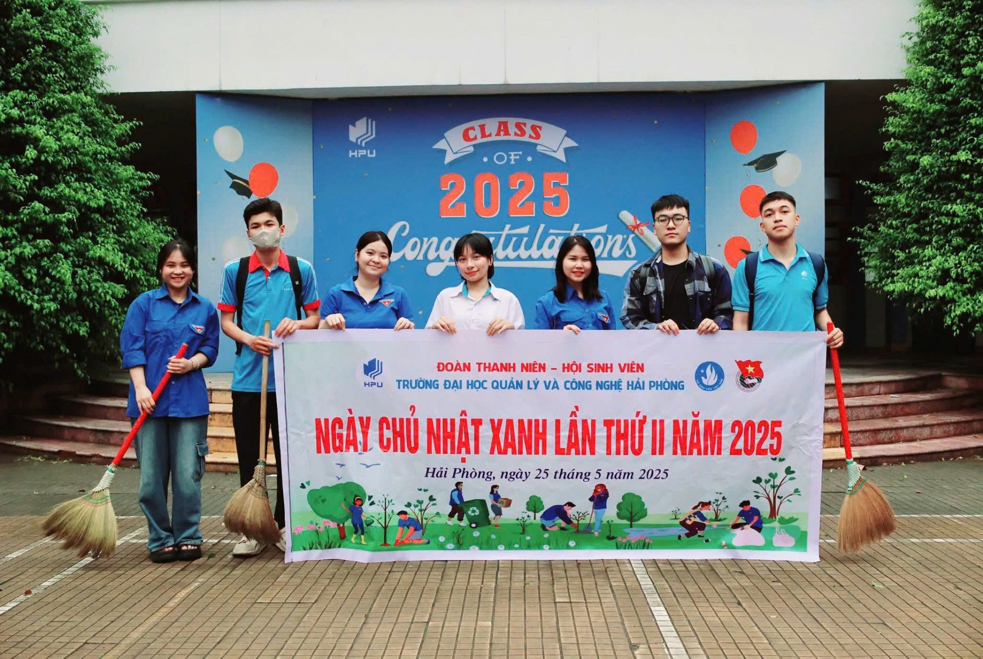 Sáng ngày 25/05/2025 Đoàn thanh niên - Hội sinh viên trường Đại học Quản lý và Công nghệ Hải Phòng tổ chức ra quân ngày chủ nhật xanh lần 2 năm 2025 với hoạt động tiến hành quét dọn nhặc rác thải nhựa trong khuôn viên nhà trường, hành lang và các phòng học, xóa quảng cáo rao vặt trên tuyến đường Dân Lập.