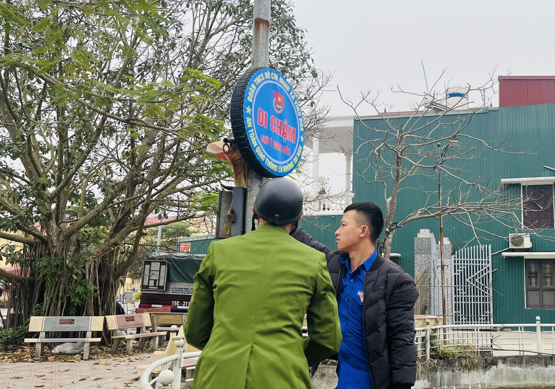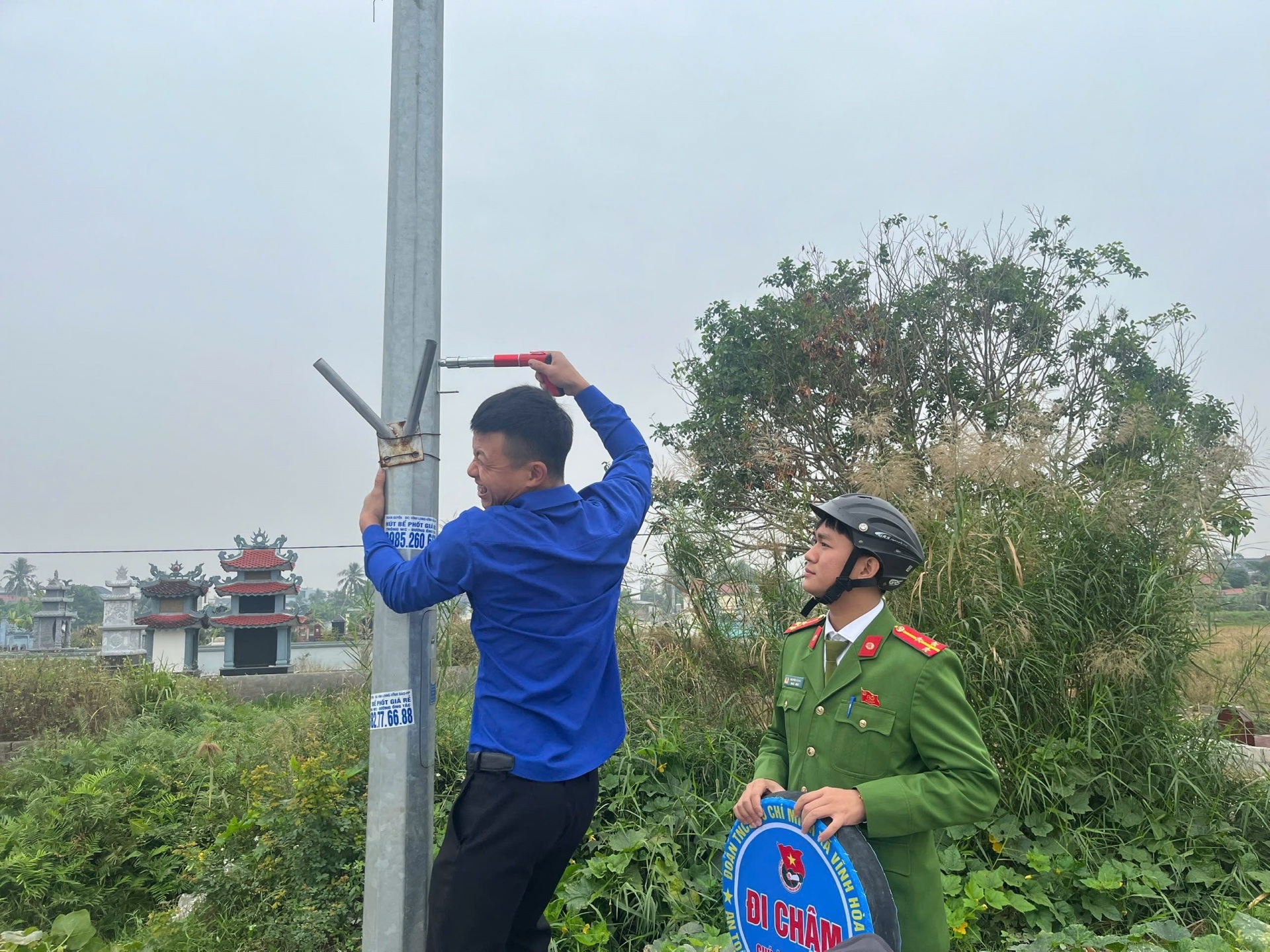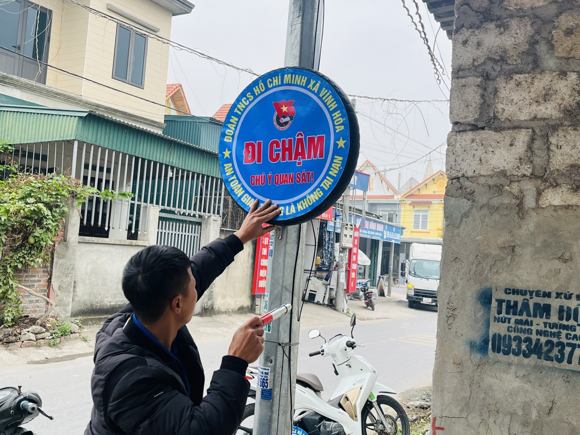 Thanh niên tình nguyện tham gia xây dựng nông thôn mới - Gắn biển cảnh báo nguy hiểm bằng vật liệu tái chế