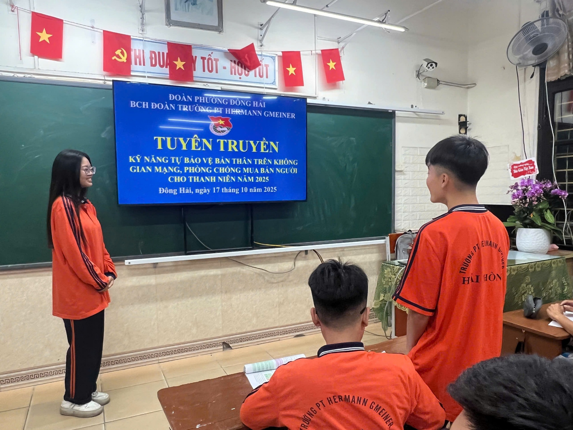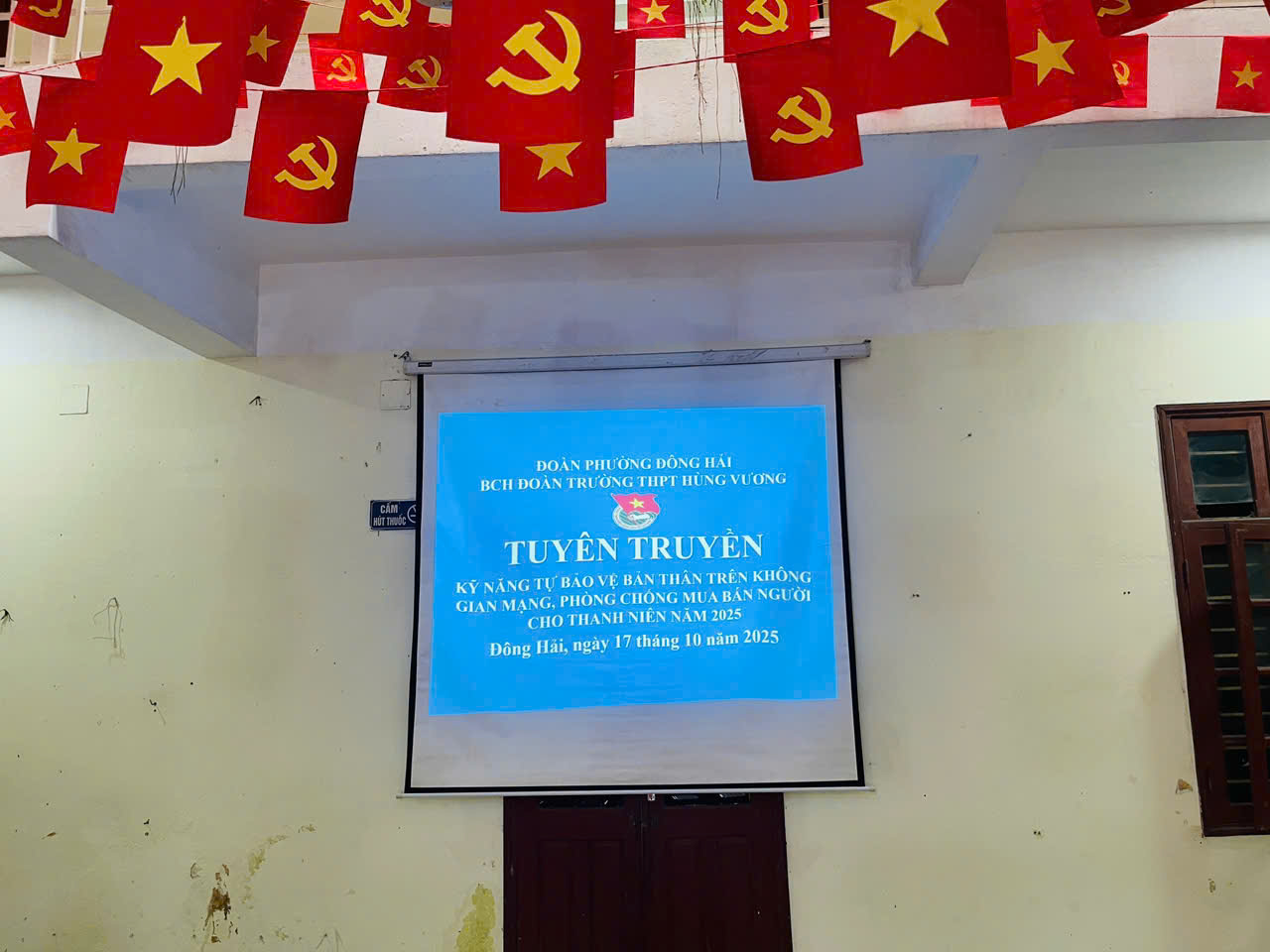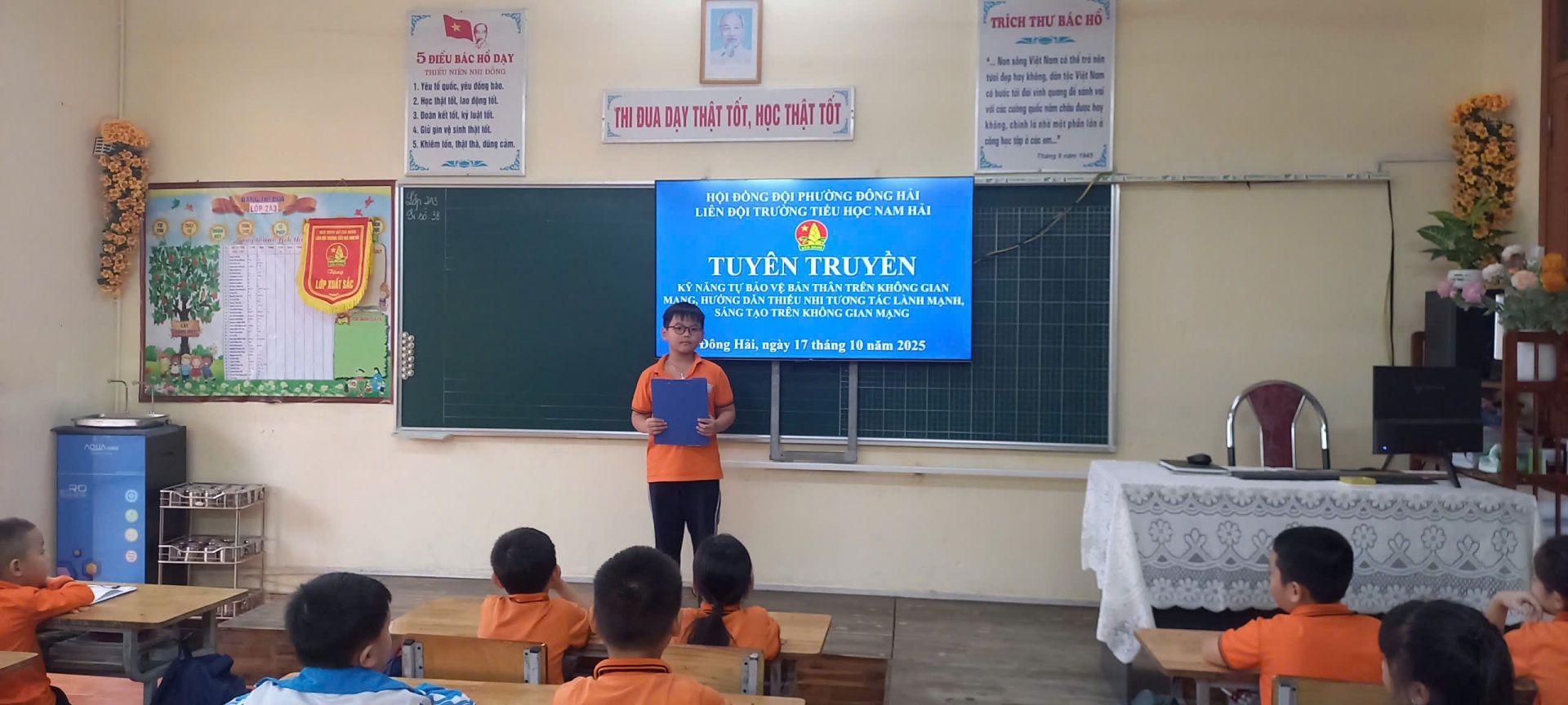 Thực hiện Chương trình Công tác Đoàn, Hội và phong trào thanh thiếu nhi năm 2025, Chương trình Công tác Đoàn, Đội và phong trào thanh thiếu nhi năm học 2025 - 2026, Đoàn phường - Hội LHTN Việt Nam - Hội đồng Đội phường Đông Hải chỉ đạo các cơ sở trực thuộc đồng loạt triển khai mô hình "TUYÊN TRUYỀN KỸ NĂNG TỰ BẢO VỆ BẢN THÂN TRÊN KHÔNG GIAN MẠNG, HƯỚNG DẪN KĨ NĂNG TƯƠNG TÁC LÀNH MẠNH, SÁNG TẠO TRÊN KHÔNG GIAN MẠNG, TUYÊN TRUYỀN PHÒNG CHỐNG MUA BÁN NGƯỜI CHO THANH THIẾU NHI" tại đơn vị lồng ghép với các hoạt động phối hợp cùng Công an phường tổ chức tuyên truyền cho thanh thiếu nhi, tổ chức sinh hoạt chi đoàn, chi đội, tổ chức các hoạt động sân khấu hoá; đến nay, 100% các đơn vị đã thực hiện và tổ chức tuyên truyền sâu rộng tới các chi đoàn, chi đội thu hút đông đảo đoàn viên, đội viên, thanh thiếu nhi tham gia. Đây là hoạt động thiết thực của tuổi trẻ phường góp phần nâng cao kĩ năng số, chuyển đổi số đặc biệt là trên môi trường mạng, trang bị kĩ năng phòng chống lừa đảo, tự bảo vệ bản thân trên không gian mạng cho thanh thiếu nhi. Dưới đây là 1 số hình ảnh: