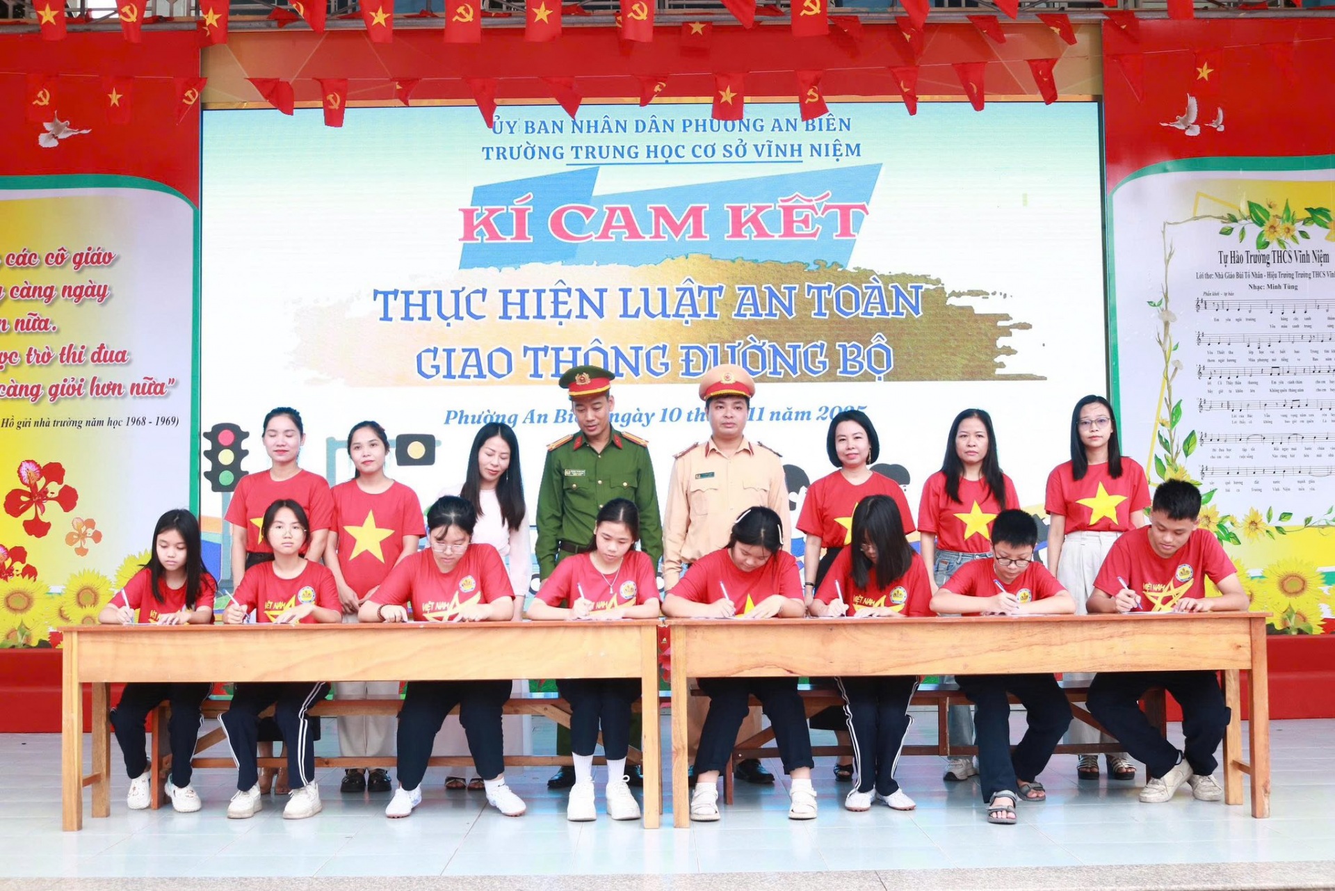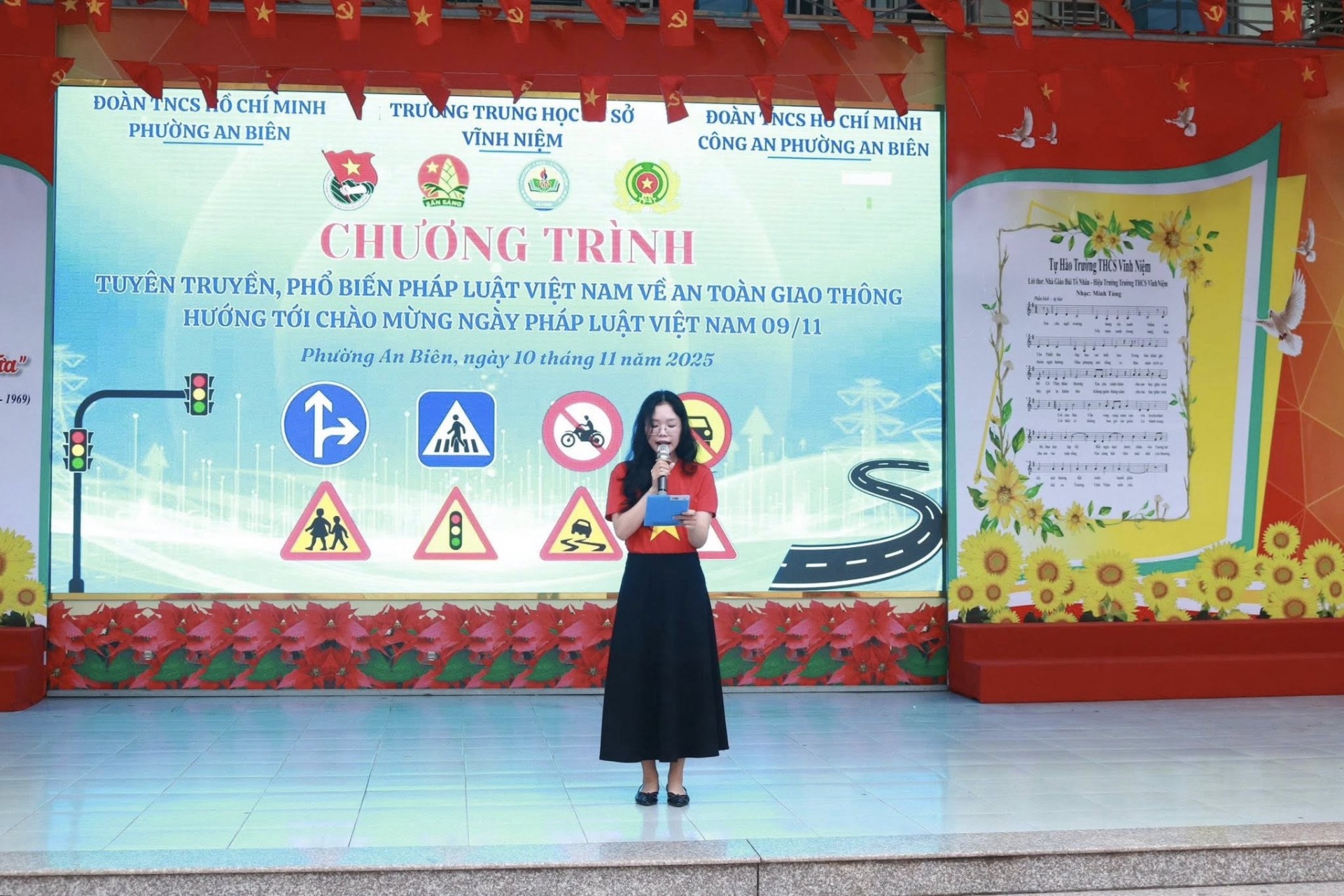 Thực hiện Chương trình Công tác Đội và phong trào thanh thiếu nhi năm học 2025 - 2026, với mong muốn xây dựng môi trường học đường an toàn - văn minh, sáng ngày 10/11/2025, Đoàn phường An Biên phối hợp với Công an phường, Trường THCS Vĩnh Niệm tổ chức Chương trình “Tuyên truyền, phổ biến pháp luật về an toàn giao thông”, hưởng ứng Ngày pháp luật Việt Nam 09/11.