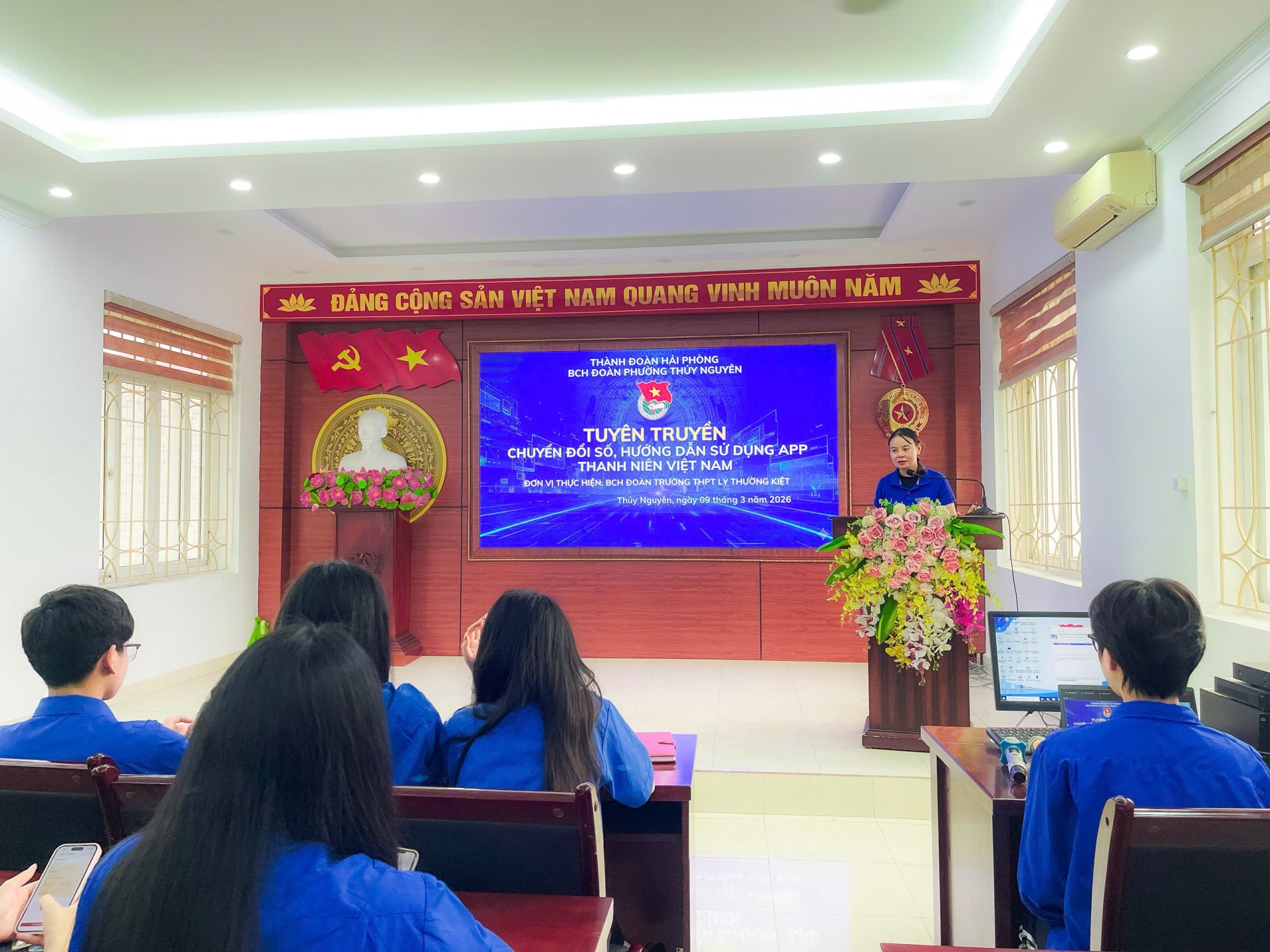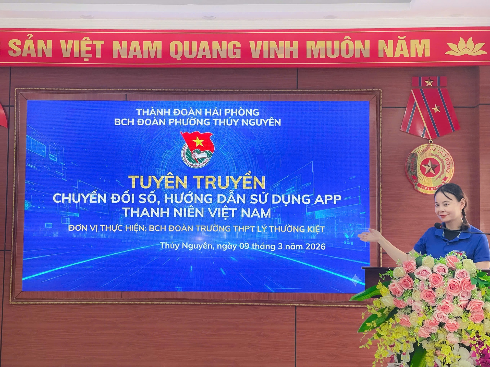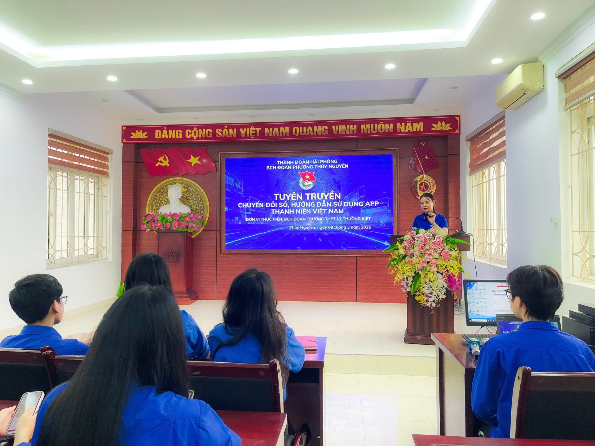 Ngày 09/3/2026, Đoàn phường Thủy Nguyên phối hợp với Đoàn Trường THPT Lý Thường Kiệt tổ chức chương trình tuyên truyền chuyển đổi số, hướng dẫn sử dụng ứng dụng Thanh niên Việt Nam cho đoàn viên, thanh niên.