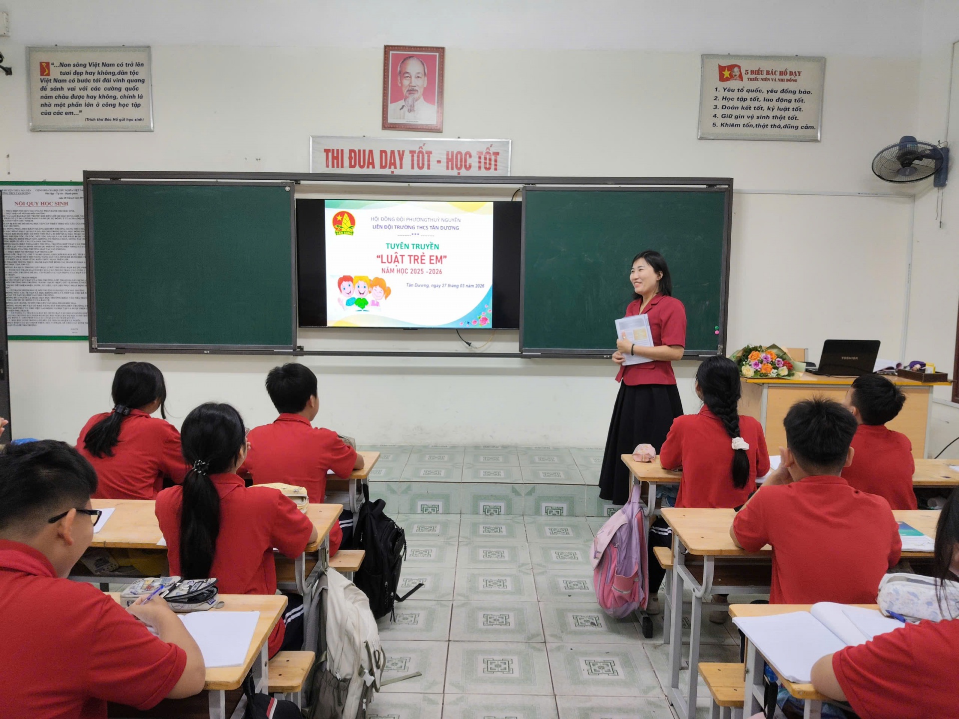 Ngày 27/3/2026, Liên đội Trường THCS Tân Dương đã tổ chức hoạt động tuyên truyền Luật Trẻ em cho các em đội viên, học sinh trong toàn trường.
